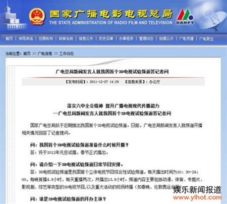 提到普通民众收看3D电视试验频道的方式,发言人说:“3D电视试验频道采用卫星通道加密传输,在全国各地有线数字电视网络的基本频道中传送。观众可以利用有线数字高清机顶盒和3D电视机,就可以收看到3D电视试验频道的具有立体效果的电视节目。在开办初期,用户可以免费收看。”
